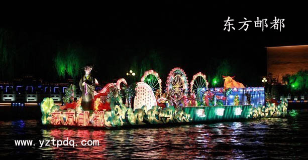 “東方郵都”號花船由高郵市承制,該花船以運河情為主題,突出了高郵豐富的歷史與文化,顯示了一個歷史文化與現(xiàn)代文明交相輝映的千年古城。