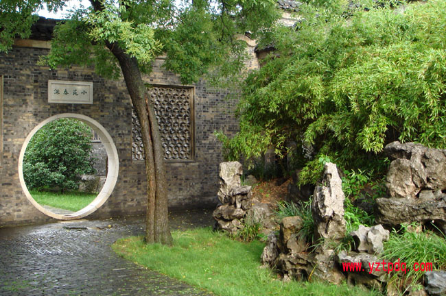 "小苑春深"與"迎曦"兩苑中間有漢白玉月洞門,兩邊有各式水磨磚細(xì)花漏窗分隔東西兩園,隔景透景合而為一。站在月門前東望小苑景色,石峰崛起,古柏參天,石榴枝繁葉茂如蓋張。高聳青灰絲縫云山式墻頂如游龍。西看小苑,曲廊幽榭,花廳書齋,牡丹臺(tái)上翠竹千竿,花木扶疏,書齋窗前,百年石榴老干如龍蛇走。