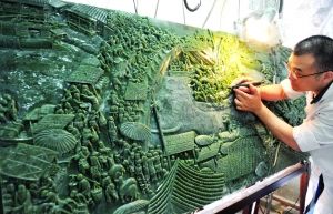 去年,揚(yáng)州著名漆器點(diǎn)螺大師楊定國曾創(chuàng)作完成了首幅點(diǎn)螺漆畫《清明上河圖》。今年,繼剪紙長卷《清明上河圖》在中國剪紙博物館正式面世之后,揚(yáng)州玉雕又給世人亮出了最震撼的一筆——碧玉《清明上河圖》插排。