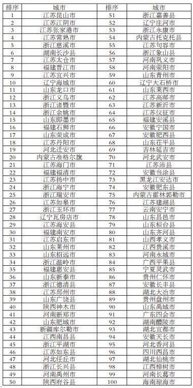 在外界一直較為關(guān)注的綜合實(shí)力百?gòu)?qiáng)縣市榜單中,江蘇、山東、浙江成為“百?gòu)?qiáng)縣”集中地,分別占有20席、15席、14席。全國(guó)前十強(qiáng)為:江蘇昆山市、江蘇江陰市、江蘇張家港市、江蘇常熟市、浙江慈溪市、湖南長(zhǎng)沙縣、江蘇太倉(cāng)市、福建晉江市、江蘇宜興市、遼寧海城市。