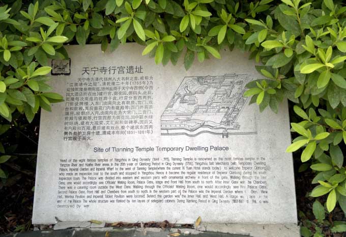 御馬頭的北面就是著名的天寧寺。乾隆第一次南巡到揚州,駐蹕地是在南郊三汊河的高旻寺,進城甚為不便。從第二次南巡始,就把天寧寺作為行宮,此后每一次乾隆南巡都要駐蹕天寧寺,每一次都要在天寧寺前的碼頭乘龍舟游覽瘦西湖,于是原本無名的天寧寺碼頭,從此便響了名,成了聞名遐邇的“御馬頭”。