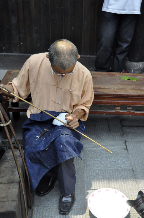 日常使用陶瓷器很普及,因此各地都能看到補(bǔ)碗匠,他們一般沒(méi)有固定的攤位,挑一副簡(jiǎn)易擔(dān)子,內(nèi)存必要的工具和材料,走街穿巷攬生意做,從那“補(bǔ)碗哦,補(bǔ)碗哦……”吆喝的長(zhǎng)腔中,你能發(fā)覺(jué)他們不是本地人。操此營(yíng)生的,以江西老表居多,景德鎮(zhèn)是我國(guó)著名的瓷都,產(chǎn)量豐富,由此衍生出“補(bǔ)碗”行業(yè)也是很自然的事情。有一句歇后語(yǔ):江西人補(bǔ)碗——自顧自,即是從補(bǔ)碗鉆孔時(shí)發(fā)出的“口茲口茲”有節(jié)奏的聲響引發(fā)的,它似乎沒(méi)有譏諷老表的意思,而是抨擊自私自利的行為。隨著補(bǔ)碗行當(dāng)?shù)南?,這句歇后語(yǔ)也已淡出江湖。補(bǔ)碗匠大多身懷絕技,小到酒杯,大到幾個(gè)人合抱不過(guò)來(lái)的醬缸,他們都有本領(lǐng)使之“完璧”。有些人家,祖?zhèn)鞯恼滟F瓷器有了裂紋,未雨綢繆,預(yù)先給“補(bǔ)”起來(lái);而尋常人家,生活節(jié)儉,只要“補(bǔ)”比買新的便宜,一只破碗他們都不舍得丟棄,湊合著補(bǔ)一補(bǔ)再用。當(dāng)然,如今可不這樣了,瓷器磕破了,一扔了之,誰(shuí)也不會(huì)想到去“補(bǔ)”。