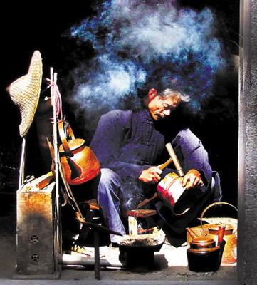 老揚州人家都喜歡銅器,那時候,一般家庭所使用的器皿都離不開銅器,婚嫁時必備兩個銅盆,子孫滿月又要送個銅盆、一雙銅筷子,父母過六十大壽,子女照例會送上一個銅盆,寓意父母金盆洗手可以享清福了。以前揚州一帶人家以擁有銅器為榮,使用銅器多的便是大戶人家。但到了“大躍進(jìn)”大煉鋼鐵時,人們紛紛把銅器捐了出來,銅器從此在日常生活中“淡出”,銅器鋪相繼關(guān)門,可銅匠擔(dān)仍然活躍在街頭巷尾。