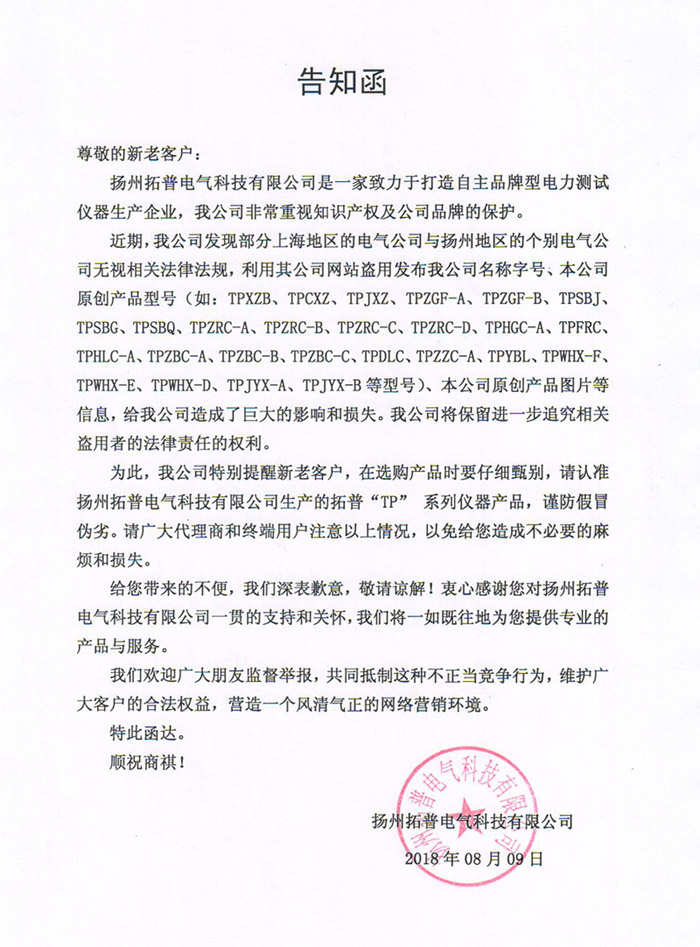 為此,我公司特別提醒新老客戶,在選購產(chǎn)品時要仔細(xì)甄別,請認(rèn)準(zhǔn)揚(yáng)州拓普電氣科技有限公司生產(chǎn)的拓普“TP” 系列儀器產(chǎn)品,謹(jǐn)防假冒偽劣。請廣大代理商和終端用戶注意以上情況,以免給您造成不必要的麻煩和損失。